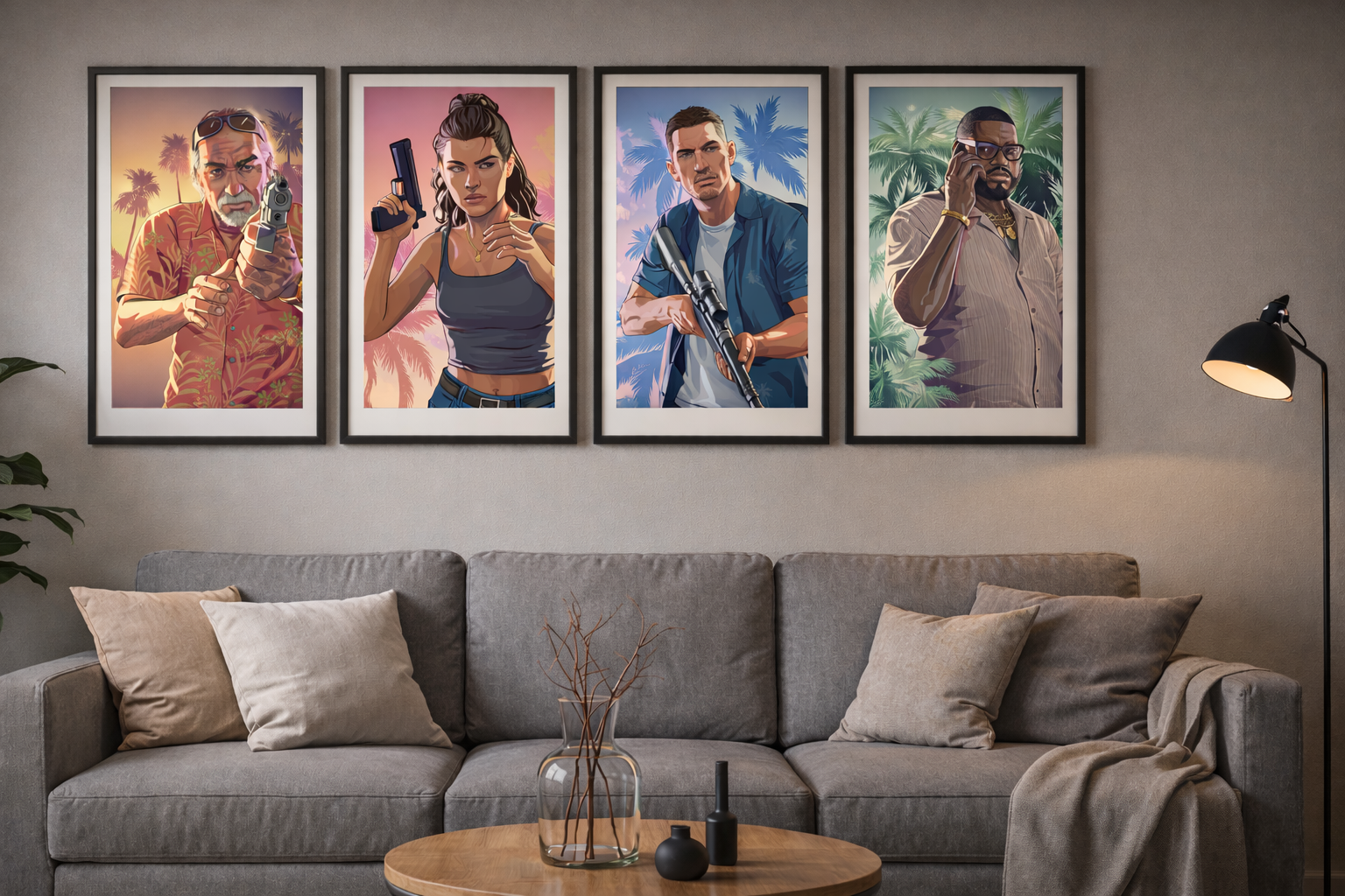 Découvre leurs histoires captivantes au travers de ces visuels saisissants, parfaits pour décorer ton intérieur et faire vivre l'expérience GTA VI chez toi.